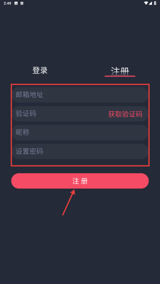 4、在注冊(cè)頁(yè)面填寫(xiě)郵箱地址、驗(yàn)證碼、昵稱、設(shè)置密碼,點(diǎn)擊注冊(cè)按鈕完成賬號(hào)注冊(cè)。