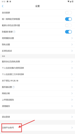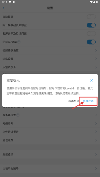 3、在設(shè)置界面,點(diǎn)擊注銷平臺賬號選項(xiàng),彈出重要提示彈窗。