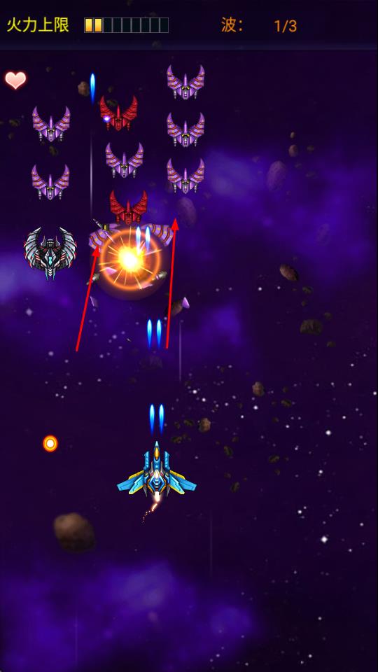 2、在太空?qǐng)鼍爸?,操控?zhàn)斗機(jī)左右、上下移動(dòng),躲避隕石等障礙物。