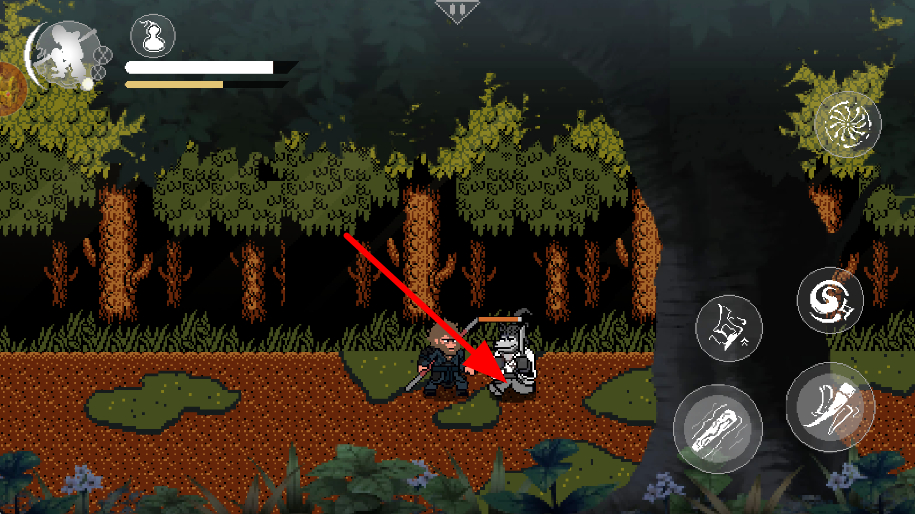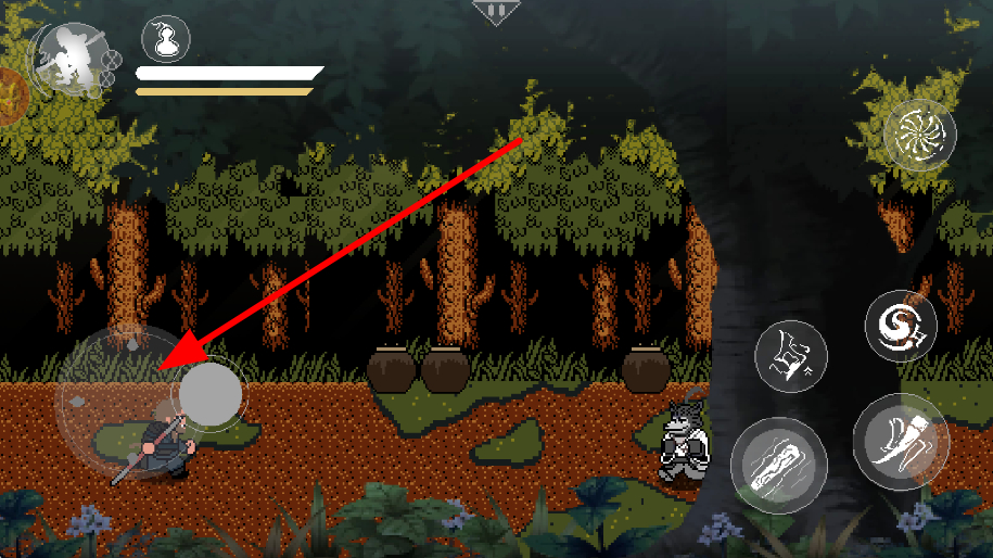 1、操控角色在森林中移動,通過操作按鈕調整角色的位置與行動方向,探索冒險場景,為后續(xù)遭遇敵人與互動做準備。