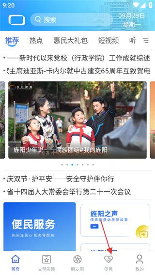 1、在愛旌陽首頁點(diǎn)擊頁面底部的便民,進(jìn)入便民服務(wù)頁面。