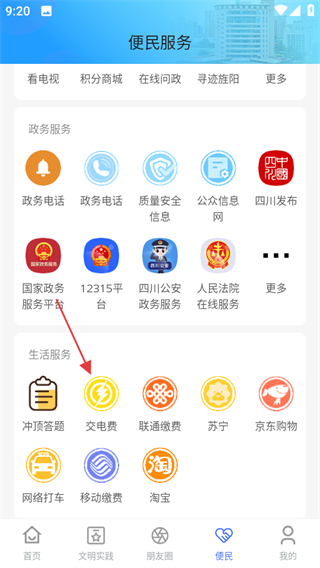 2、在便民服務(wù)頁面,點(diǎn)擊交電費(fèi)選項(xiàng),進(jìn)入交電費(fèi)相關(guān)頁面。