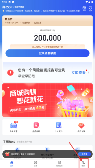 1、打開(kāi)融360金融應(yīng)用,點(diǎn)擊底部我的選項(xiàng),進(jìn)入個(gè)人中心頁(yè)面。