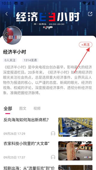 4、在經(jīng)濟半小時詳情頁,點擊關注,關注該財經(jīng)號。