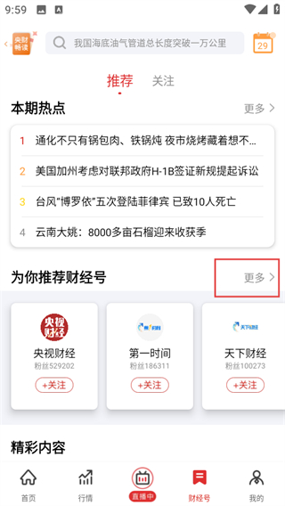 2、在財經(jīng)號頁面,點擊為你推薦財經(jīng)號旁的更多,查看更多財經(jīng)號。