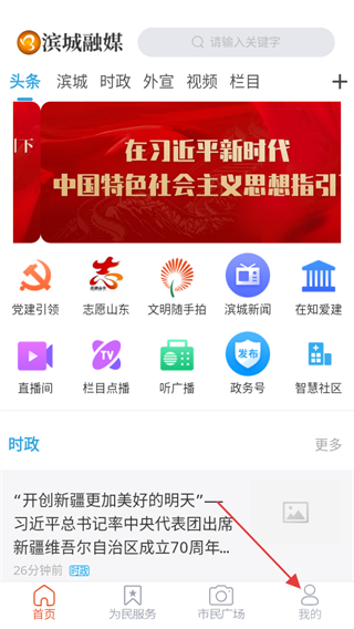 1、打開濱城融媒,在首頁點擊頁面底部的我的,進(jìn)入個人頁面。