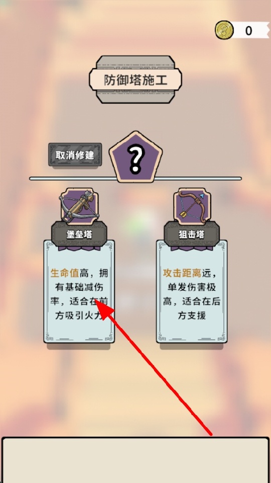 3、進入防御塔施工,堡壘塔生命值高且有基礎減傷率,狙擊塔攻擊距離遠、單發(fā)傷害高,適合在后方支援。