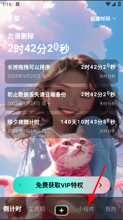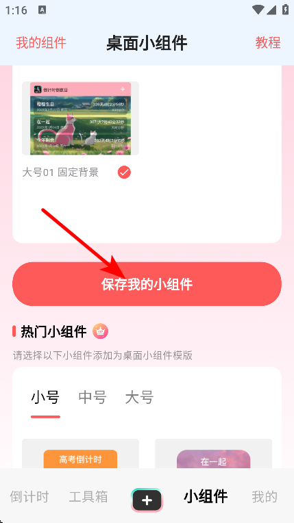 2、在倒計(jì)時光主頁面,點(diǎn)擊小組件,進(jìn)入小組件選擇頁面。