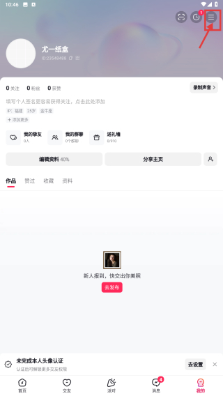 2、在個(gè)人中心頁(yè)面,點(diǎn)擊右上角菜單圖標(biāo),展開(kāi)功能列表。