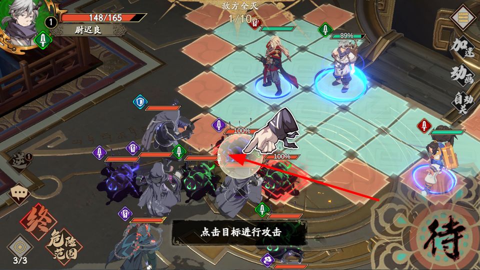 1、在游戲戰(zhàn)斗場(chǎng)景中,點(diǎn)擊想要攻擊的目標(biāo),發(fā)起移動(dòng)攻擊指令,開(kāi)啟與敵人的交鋒,為后續(xù)戰(zhàn)斗奠定基礎(chǔ)。