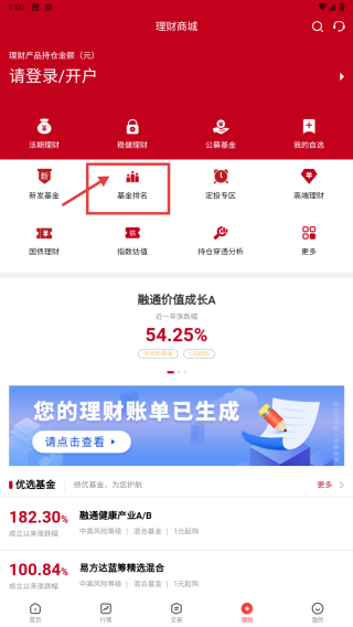 2、在理財商城頁面,點擊基金排名選項,進入基金排名界面。