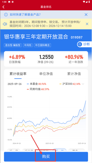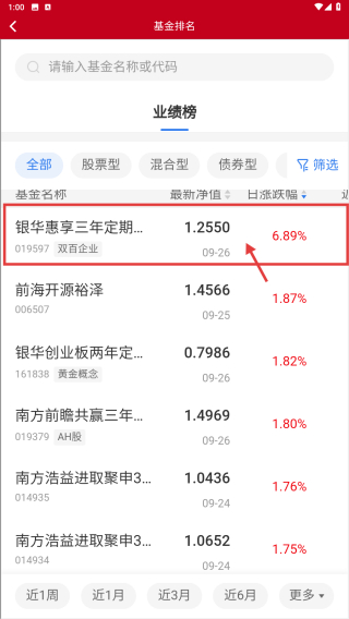 3、在基金排名界面,找到銀華惠享三年定期開放混合條目,點擊進入基金詳情頁。
