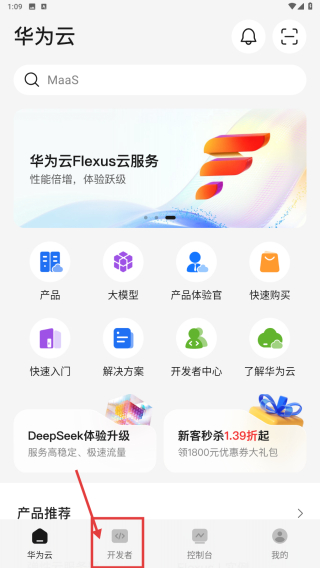 1、打開華為云應(yīng)用,點(diǎn)擊底部開發(fā)者選項(xiàng),進(jìn)入開發(fā)者頁面。