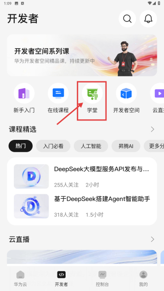 2、在開發(fā)者頁面,點(diǎn)擊學(xué)堂選項(xiàng),進(jìn)入開發(fā)者學(xué)堂界面。