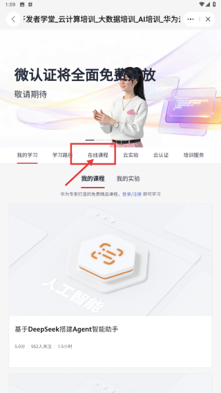 3、在開發(fā)者學(xué)堂界面,點(diǎn)擊在線課程標(biāo)簽,瀏覽在線課程列表。