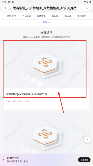 4、在在線課程列表中,找到使用DeepSeek實(shí)現(xiàn)代碼自動生成課程,點(diǎn)擊進(jìn)入學(xué)習(xí)。