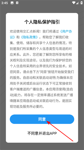 1、在個(gè)人隱私保護(hù)指引彈窗中,點(diǎn)擊同意,進(jìn)入交匯點(diǎn)新聞APP。