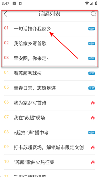 3、在話題列表頁(yè)面,選擇要參與的話題,如一句話推介我家鄉(xiāng)。