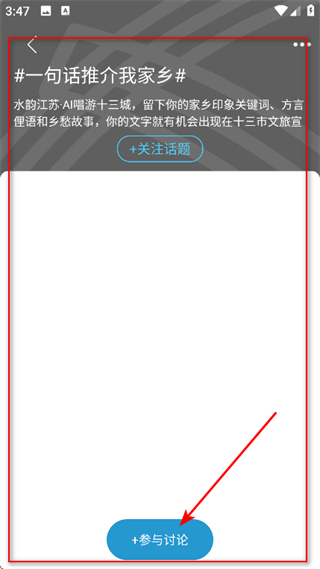 4、進(jìn)入話題詳情頁(yè)面后,點(diǎn)擊+參與討論,即可參與該話題討論。