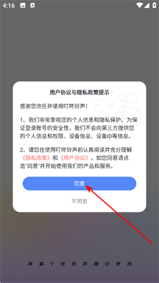 1、在用戶協(xié)議與隱私政策提示彈窗中,點(diǎn)擊同意,進(jìn)入主頁面。