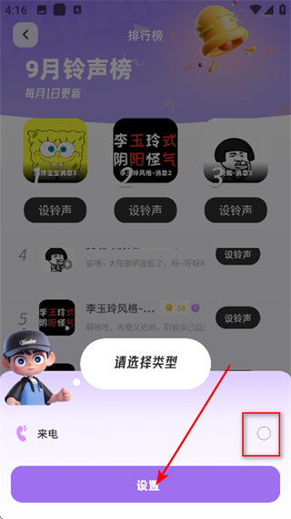 4、在彈出的請(qǐng)選擇類型窗口中,選擇類型后點(diǎn)擊設(shè)置,完成鈴聲設(shè)置。