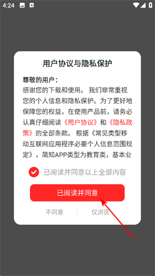 1、在用戶協(xié)議彈窗中,點(diǎn)擊已閱讀并同意,進(jìn)入APP。