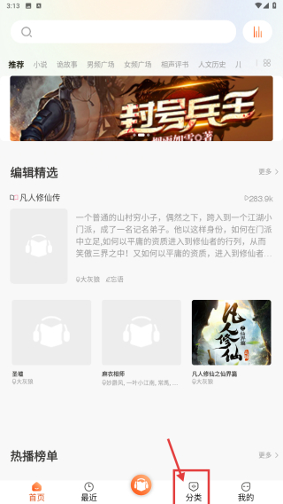 1、打開有聲讀物類應(yīng)用,點(diǎn)擊底部分類選項(xiàng),進(jìn)入分類頁(yè)面。