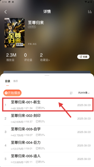 4、在詳情頁(yè),點(diǎn)擊至尊歸來-001-新生選項(xiàng),開始收聽該有聲讀物。