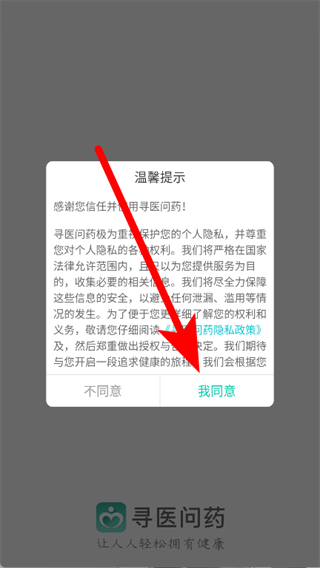 1、打開尋醫(yī)問藥,在溫馨提示頁面點(diǎn)擊我同意。