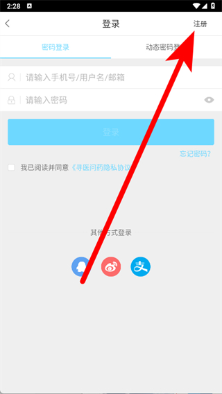 3、在登錄頁面,點(diǎn)擊右上角注冊。