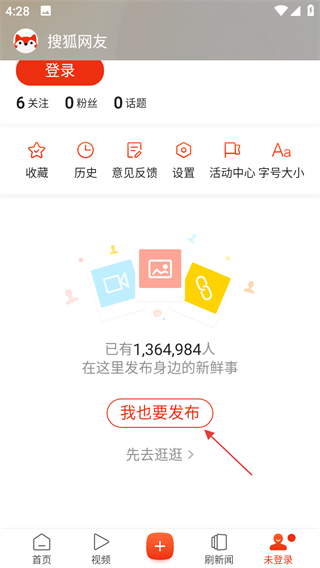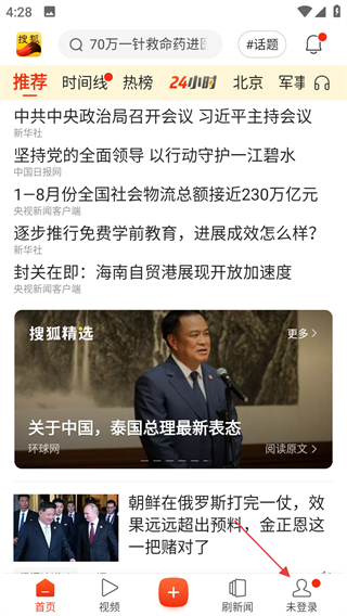 1、打開搜狐新聞,點擊頁面底部的未登錄,進入個人頁面。