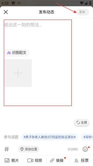 3、在發(fā)布動態(tài)頁面輸入想法等內(nèi)容后,點擊發(fā)布即可發(fā)布文章。