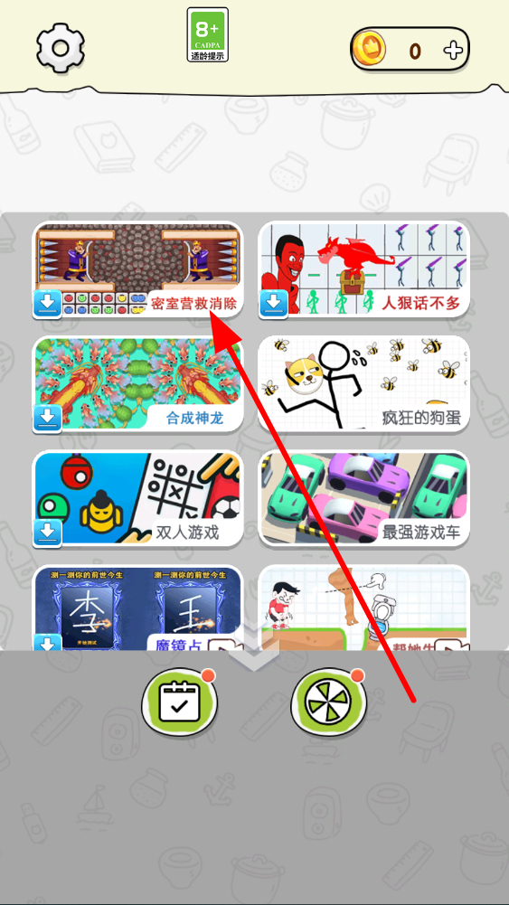 1、玩家首先進(jìn)入主界面,在眾多游戲選項(xiàng)中,點(diǎn)擊密室營救消除選項(xiàng),進(jìn)入該游戲的專屬界面,開啟密室救援消除之旅。