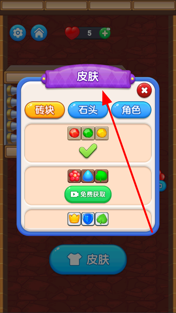 2、開始游戲后,根據(jù)喜好選擇角色或道具皮膚,點(diǎn)擊皮膚按鈕,彈出挑選自己喜歡的磚塊石頭或角色外觀,增添游戲樂趣。
