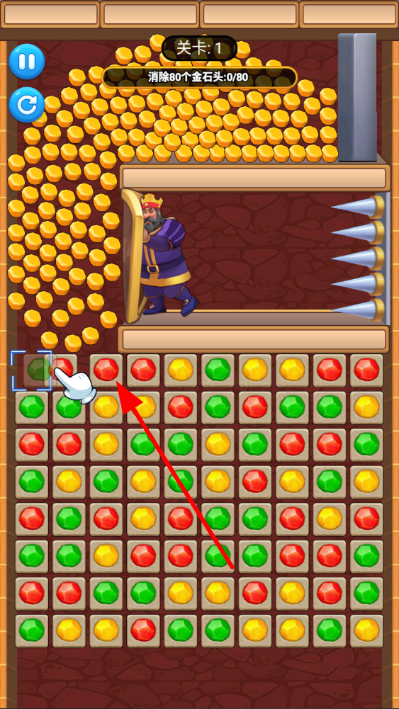 3、進(jìn)入關(guān)卡后,點(diǎn)擊相鄰且相同顏色的磚塊,使三個(gè)或三個(gè)以上相同磚塊連成一線,完成消除操作,朝著解救任務(wù)目標(biāo)努力。