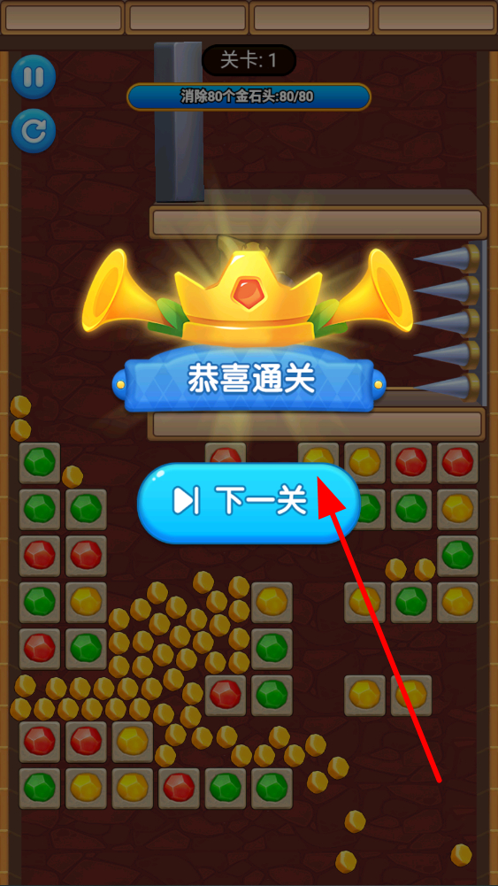 4、持續(xù)進(jìn)行消除操作,當(dāng)完成關(guān)卡指定的消除任務(wù)后,就能成功通關(guān),點(diǎn)擊下一關(guān)按鈕,即可挑戰(zhàn)后續(xù)關(guān)卡,繼續(xù)體驗(yàn)。