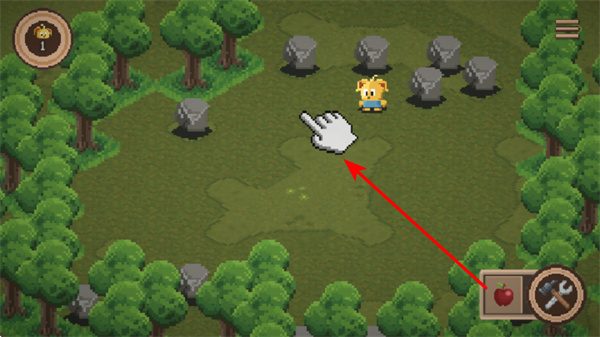 3、點(diǎn)擊界面中的手勢(shì)指引區(qū)域,可移動(dòng)角色到指定位置,同時(shí)可利用蘋果圖標(biāo)恢復(fù)角色狀態(tài)。