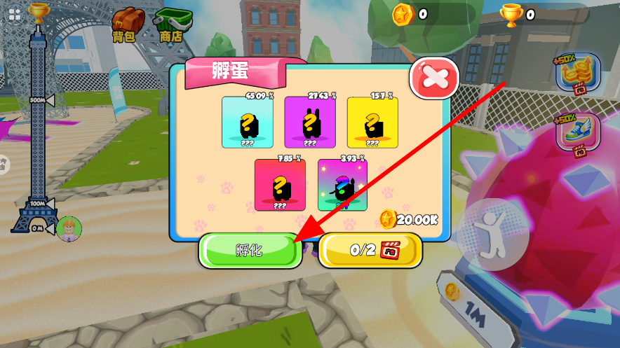 3、當(dāng)遇到神秘蛋時(shí),進(jìn)入孵蛋界面,展示不同的蛋以及孵化相關(guān)選項(xiàng),點(diǎn)擊孵化按鈕,獲取孵化后的物品或角色。