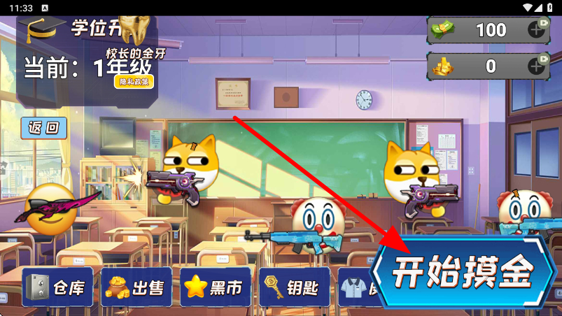 1、首先進入游戲界面,點擊開始摸金按鈕,開啟在校園的摸金之旅,進入校園場景,準備探索收集物品。