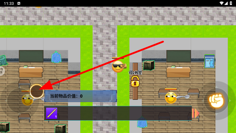 3、玩家可以點擊右側(cè)的拳頭按鈕,與相關(guān)物品或場景敵人進行攻擊,比如在教室里,通過此操作擊敗敵方獲取物品。