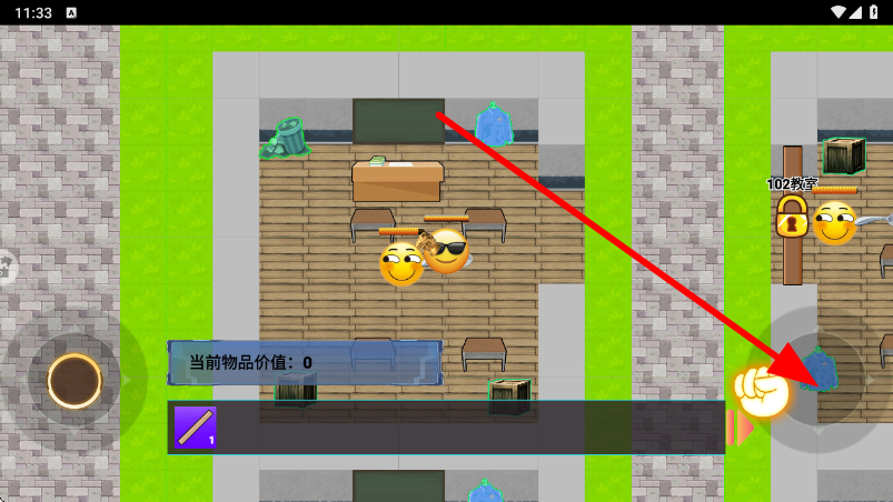 2、進入校園場景后,通過左側(cè)的移動操控按鈕,控制角色在校園的各個教室等區(qū)域移動,尋找可收集的物品,推進摸金進程。