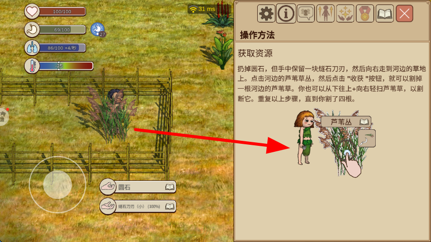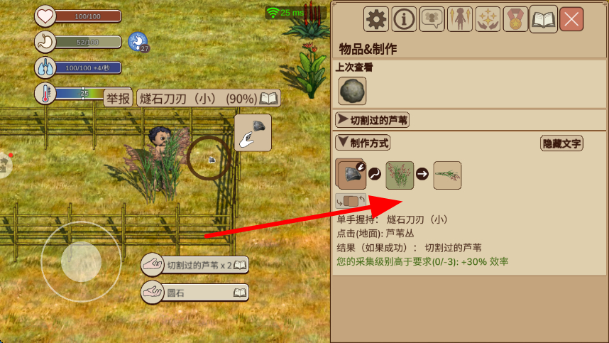 3、進(jìn)行物品制作,根據(jù)物品制作界面的指引,單手握持燧石刀刃,點(diǎn)擊地面的蘆葦叢,成功后就能得到切割過(guò)的蘆葦。