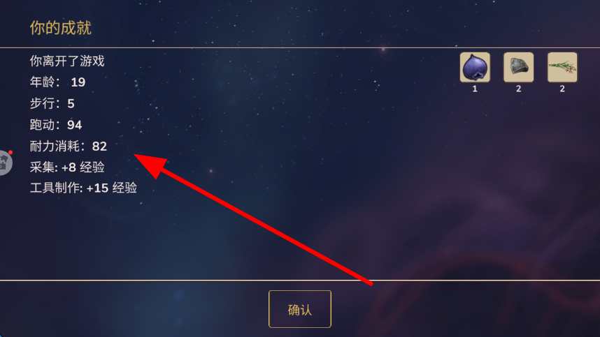 4、當(dāng)離開(kāi)會(huì)出現(xiàn)你的成就,這里會(huì)展示年齡、步行、跑動(dòng)等數(shù)據(jù),以及采集、工具制作獲得的經(jīng)驗(yàn),能清晰看到游戲過(guò)程中的成果。