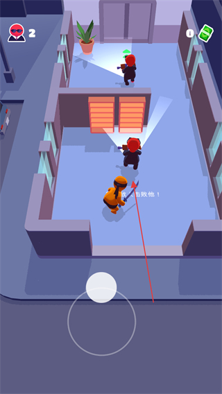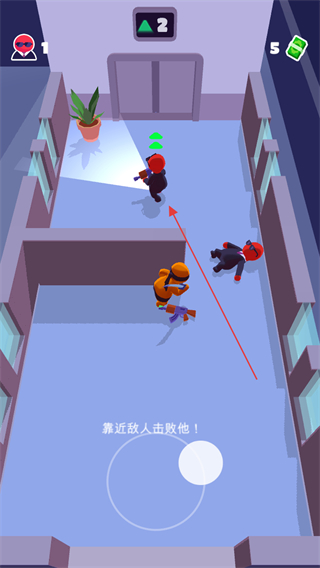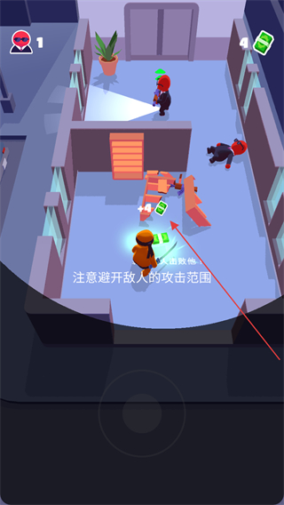 3、當(dāng)靠近敵人且未被察覺時,迅速出擊擊敗敵人,同時收集場景中的綠色鈔票道具。