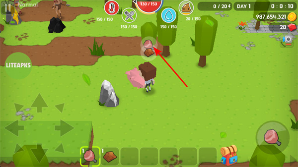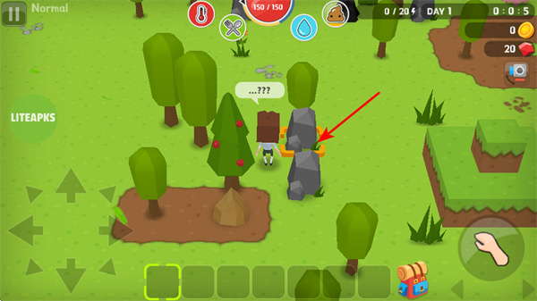 1、靠近場景中的石塊區(qū)域,觸發(fā)互動,獲取石頭資源,用制作工具或建筑,助力發(fā)展。