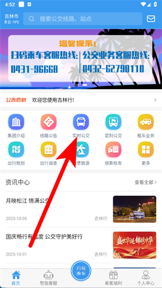 1、打開吉林行,點(diǎn)擊首頁(yè)的實(shí)時(shí)公交圖標(biāo)。