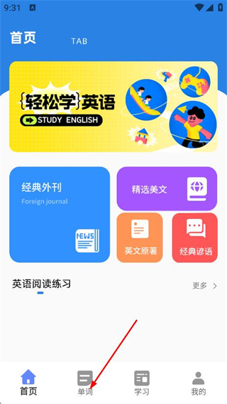 1、在英語(yǔ)單詞聽(tīng)寫(xiě)的首頁(yè),點(diǎn)擊底部單詞,進(jìn)入單詞頁(yè)面。