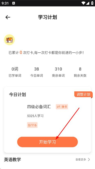 3、在學(xué)習(xí)計(jì)劃頁(yè)面,點(diǎn)擊開(kāi)始學(xué)習(xí),進(jìn)入詞匯學(xué)習(xí)頁(yè)面。