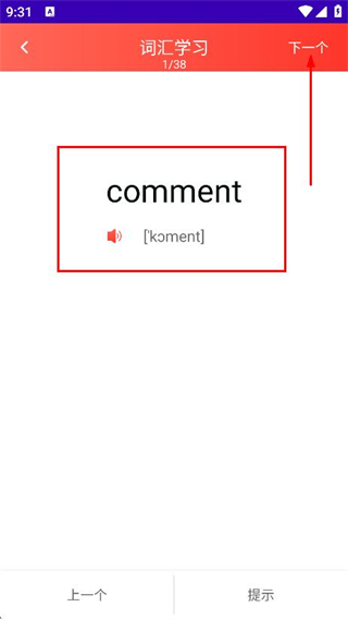 4、在學(xué)習(xí)頁(yè)面,可學(xué)習(xí)單詞,還能點(diǎn)擊下一個(gè)即可學(xué)習(xí)下一個(gè)單詞。