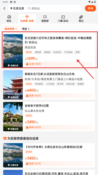 2、在定制游頁面,選擇長白山目的地,進入該目的地的旅游產(chǎn)品列表頁面。